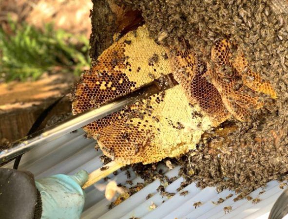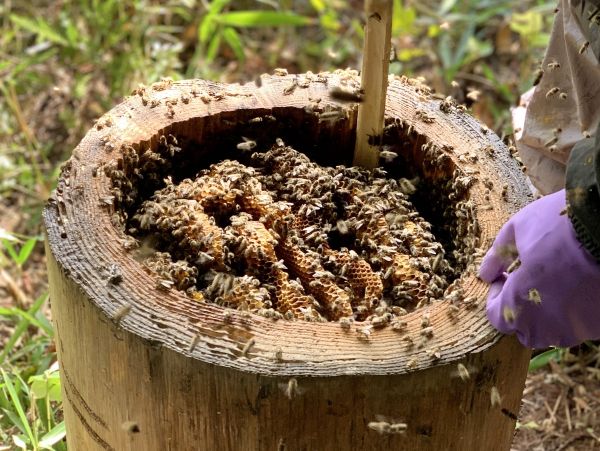 「ウト」と呼ばれる自作の巣箱を山々に据えて、春先にニホンミツバチを招き入れたら身の回りのお世話をし、秋が暮れる頃にたった一度だけ、ミツバチたちの冬の食糧を残して採蜜します。この、ミツバチにも優しい自然養蜂の百花蜜はとても貴重なものです。