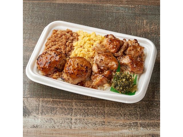 香ばしく炙り焼きにした焼き鳥やつくねと鶏そぼろ、玉子そぼろをのせたお弁当です。 ※宮崎県、鹿児島県では取り扱いがございません。