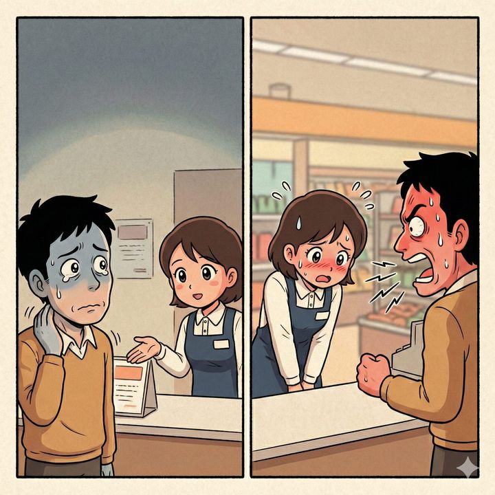 自分の勘違いで店員に怒鳴り散らしてしまった恥ずかしさと、すぐには解決できない焦りが混ざったような、なんとも言えない表情です。