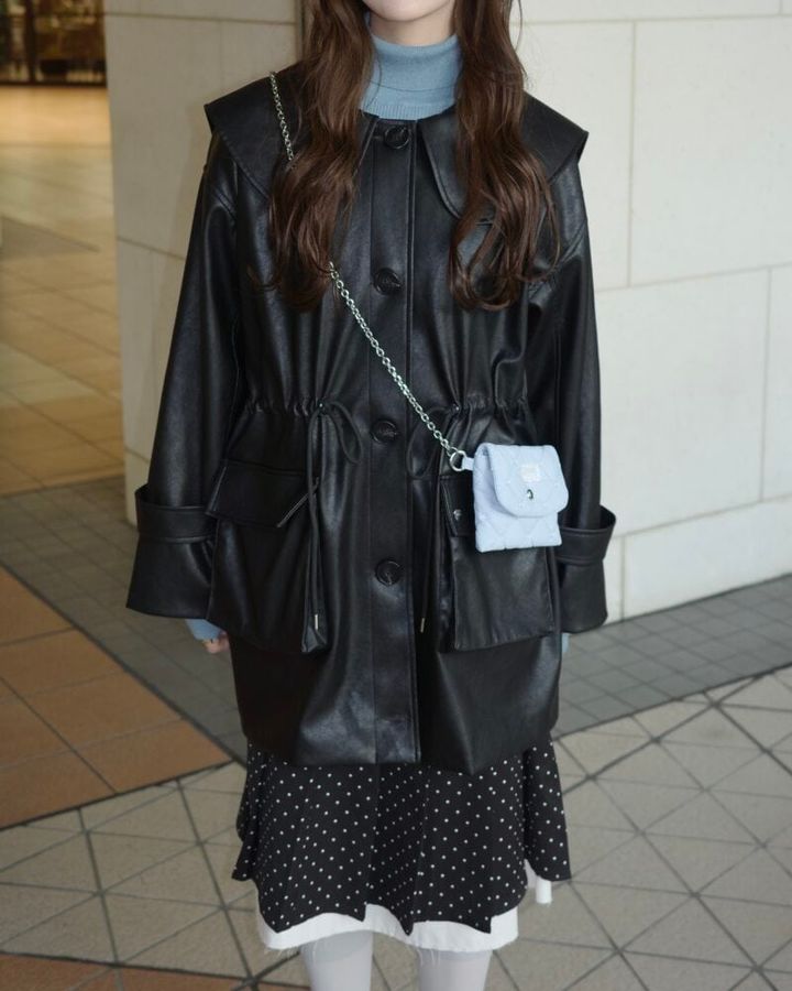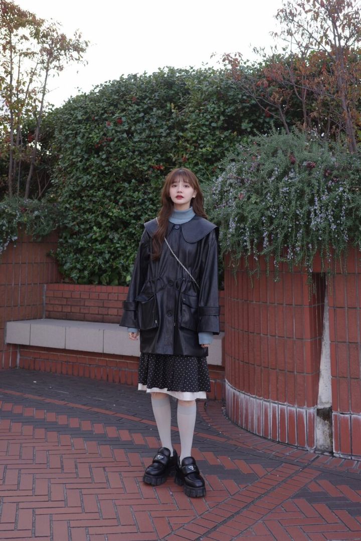 「使いやすさや着回しを重視すると、冬のアウターはつい黒を選びがち。そうなると、スタイリングがマンネリして見えることも。そこで、今回はニットでブルーを投入。さらにドット柄スカートを使って、コーデをワンランクアップさせました! 足元は、ソックスとシューズで軽やかにまとめたのもポイントです」(idem / ANUブランドディレクター・村田倫子さん)
