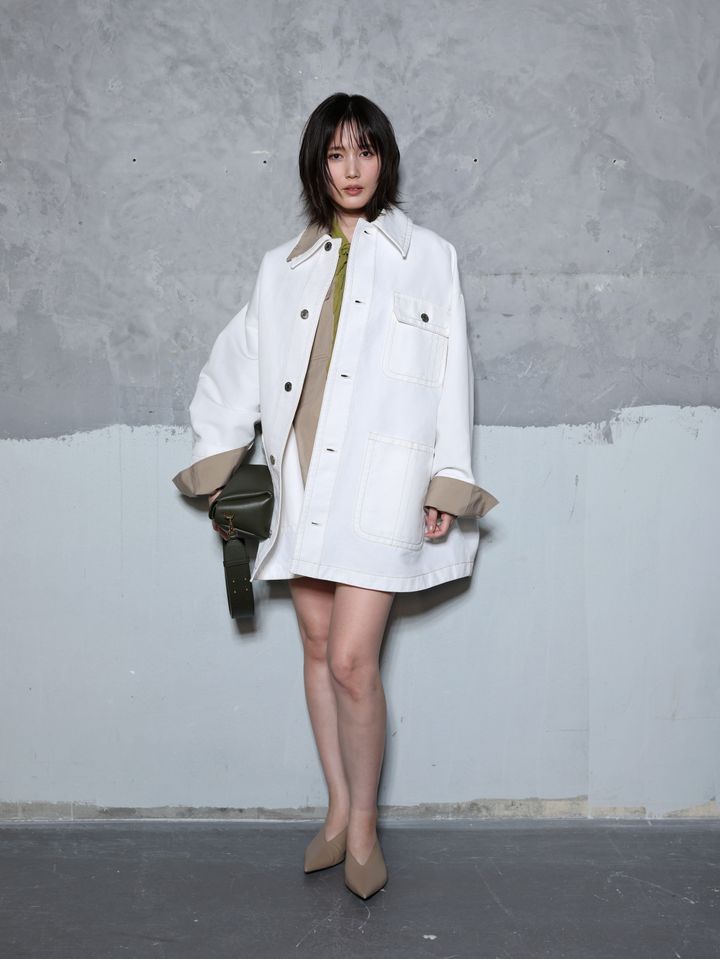 オフホワイトのジャケットとブルーデニムの透明感ある爽やかなコーディネートを披露しました。アッシュグレーのヘアスタイルとあいまって、洗練された大人の雰囲気を感じさせます。