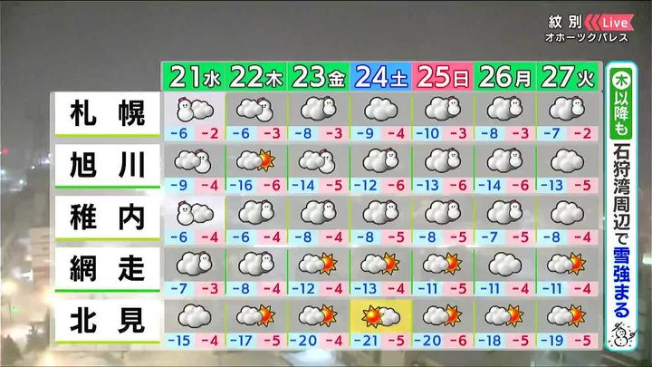 日本海側を中心に雪が降り、札幌周辺でも積雪が多くなります。気温はきょう20日(火)と同じくらいで、厳しい寒さが続きます。