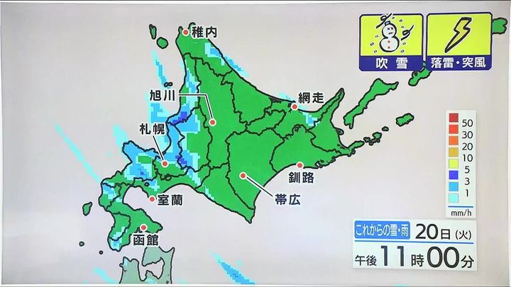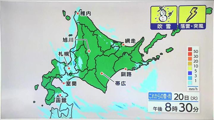 その後も札幌周辺や留萌方面、きょう20日(火)大雪となった知床周辺で雪が降るでしょう。吹雪や落雷、突風にも注意してください。