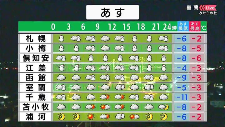 札幌や小樽、江差など早朝と夜を中心に雪が強まるでしょう。倶知安は一日を通して雪が降り、積雪が多くなりそうです。函館や室蘭も時折、雪が降るでしょう。