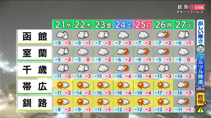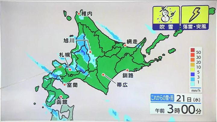 留萌や空知地方を中心に雪が強まり、あす21日(水)夕方までの24時間に局地的に50センチの大雪です。寒さが厳しく、少しの風でも地吹雪がおきやすくなるでしょう。