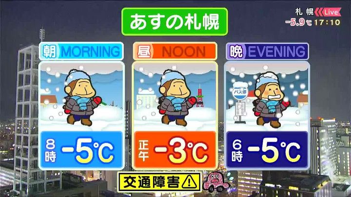 特に早朝とお帰りの時間帯に雪が強まりそうです。最新の交通情報も確認し、時間にゆとりを持って行動しましょう。気温は朝からあまり上がらず、-5度くらいです。