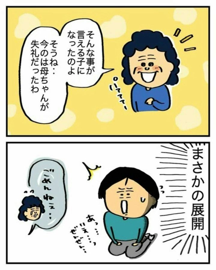 「今のは失礼だった」と、あっさりと非を認め、謝ってくれた彼の母。とても素敵ですね。修羅場ではなく、場がほっこり和みました。