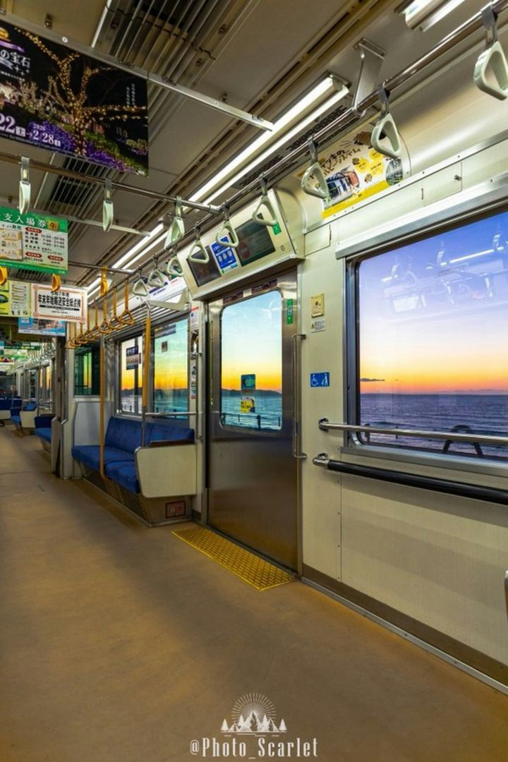 実際に江ノ電に乗るのは今回が初めてだったというスカーレットさん。車内に入った瞬間、思わず感動してしまう景色が窓の外に広がっていました。まだ人も少ない早朝のこと、電車が走るその横に、広大な海ときれいな朝焼けの空が。ゆっくり色づいていく景色、波の向こうに朝が始まろうとしているその瞬間。感動的です。
