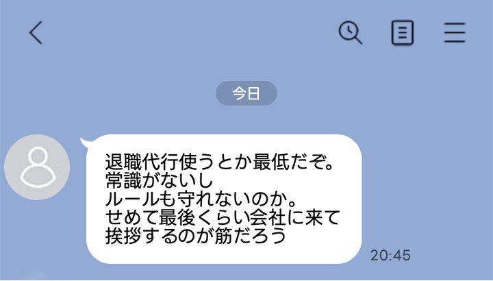 「退職代行使うとか最低だぞ。常識がないし、ルールも守れないのか。せめて最後くらい会社に来て挨拶するのが筋だろう」