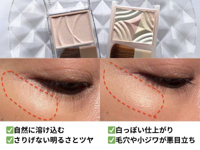 一方、「セザンヌ ブレンドカラーチーク H1 ペールハイライト」は、繊細なパールによる煌めきでツヤ感や立体感を与える王道のハイライト。確かに繊細な輝きなのですが、ホワイト、イエロー、ピンク、ベージュと色とりどりのパールが肌のうえで目立つ印象があります。そのため、肌から若干浮く印象があり、40・50代の肌に塗ると、毛穴やシワを悪目立ちさせる可能性があります。