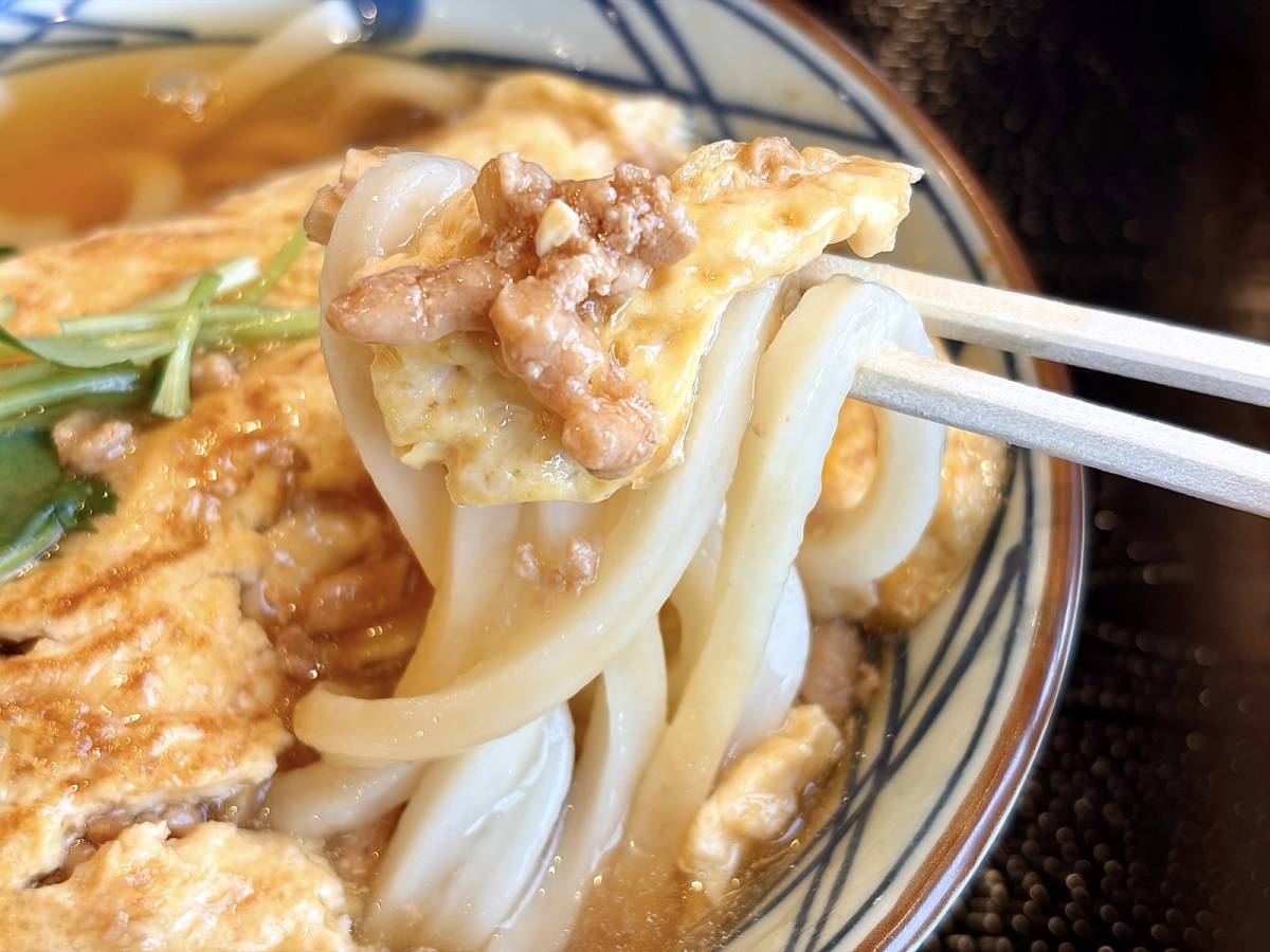 大きなだし巻き玉子と肉そぼろを組み合わせた、季節限定の新作メニュー。丸亀製麺のこだわりがたっぷり詰まった本気でウマい一品です。