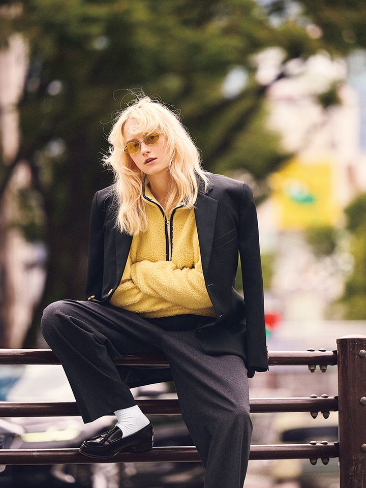 黒ワイドジャケット 61,600円/SEA(エスストア) 黒ワイドジャケット 61,600円/SEA(エスストア) グレーテーパードパンツ(メンズ) 59,400円/ATON(ATON AOYAMA) サングラス 27,720円/Ray-Ban(ルックスオティカジャパン カスタマーサービス) ソックス 2,750円/ブルーフォレ(LITTLE LEAGUE INC.) ローファー 9,130円/HARUTA