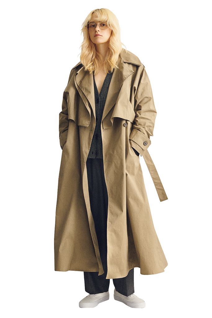 共布ベルトつきベージュトレンチコート 313,500円/ジア スタジオ(ザ・ウォール ショールーム) グレーVネックニットカーディガン 32,780円/オブラダ(シンチ) グレーテーパードパンツ(メンズ) 59,400円/ATON(ATON AOYAMA) 眼鏡 27,800円/CARIN(スタードリーム ジャパン) スニーカー 7,150円/Vans(Vans Japanカスタマーサポート)