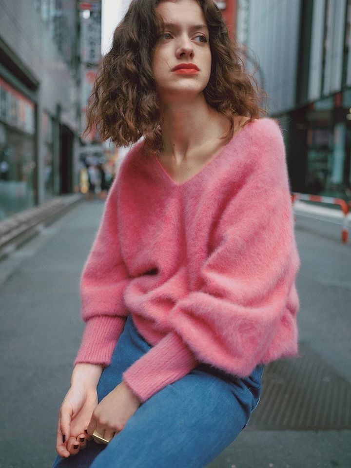 「甘くてかわいい」を詰め合わせたデザイン。ルーズなシルエットのモヘアニットも鎖骨がのぞく胸元のカッティングで凛とした表情に。アームをふくらませたシルエットも色の強さと、ふんわりとした素材の甘さを中和。