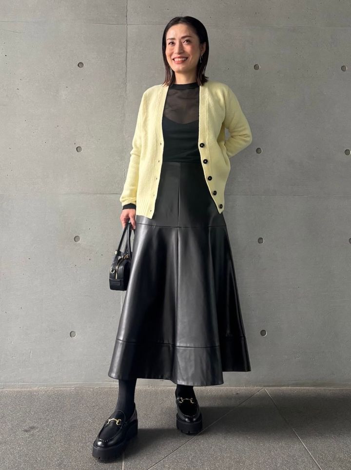 レザーならではのハリ感が上品に見せてくれるフレアスカート。ボトムスにウェイトがある分、トップスにはレモンイエローのニットとシアーなインナーを持ってくると野暮ったくならず◎。