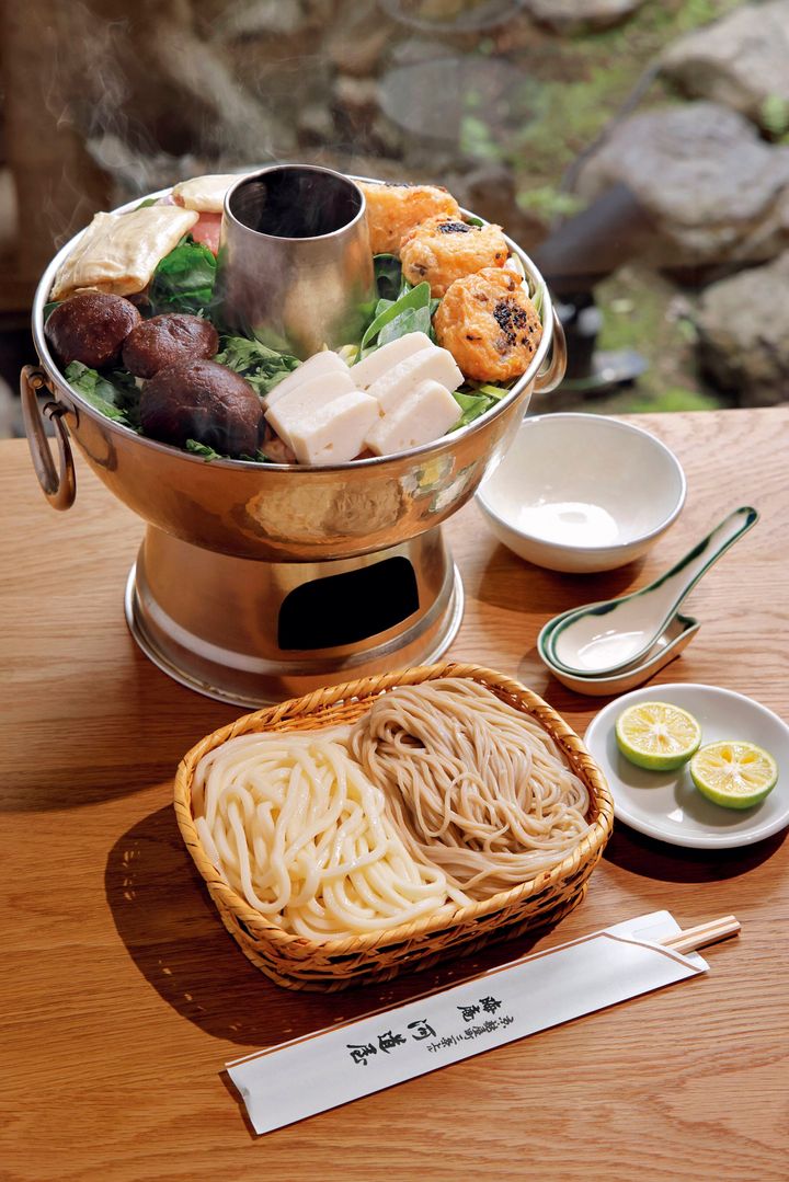 創業当時からファンが多いこの鍋料理は、十四代目が中国の火鍋「火鍋子」にちなんで命名した名物。湯葉や真蒸、飛龍頭、椎茸、菊菜など8種ほどの具材を、利尻昆布と3種の節でとった出汁でぐつぐつと煮込みながらいただきます。締めは自家製の蕎麦とうどんを入れ、すだちを搾って味わうのがおすすめです。