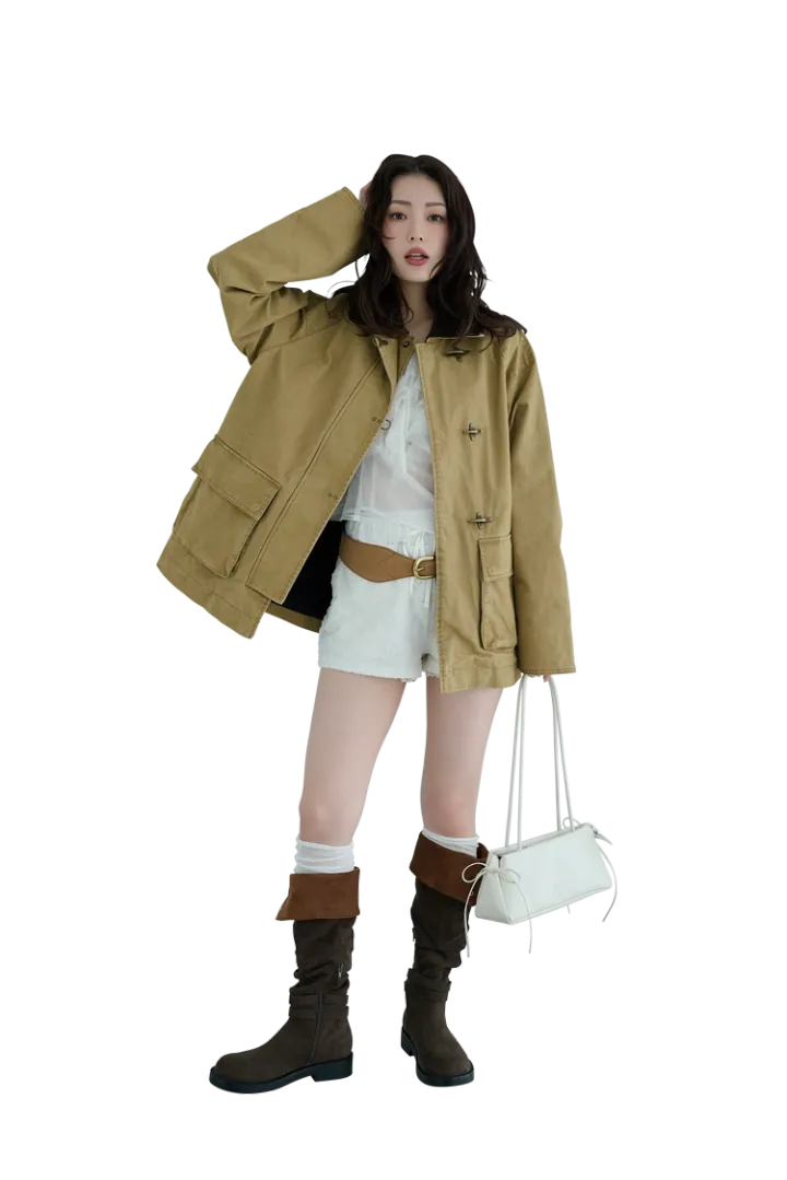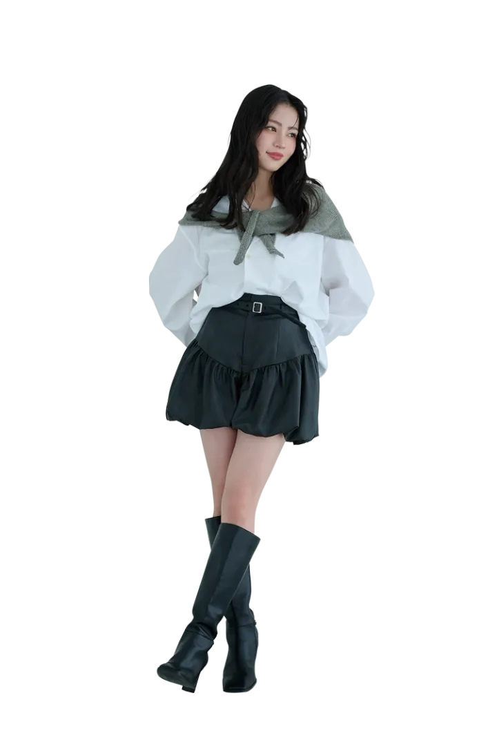 ジャケット 19,900円、ベルト 6,990円/ともにMANGO フリルブラウス 9,790円/LILLIAN CARAT(リリアン カラット)ショートパンツ 10,620円/ASURA(HANA KOREA)バッグ 4,390円/Olu. ソックス 1,100円/靴下屋(Tabio)ロングブーツ 14,900円/チャールズ&キース(チャールズ&キース ジャパン)