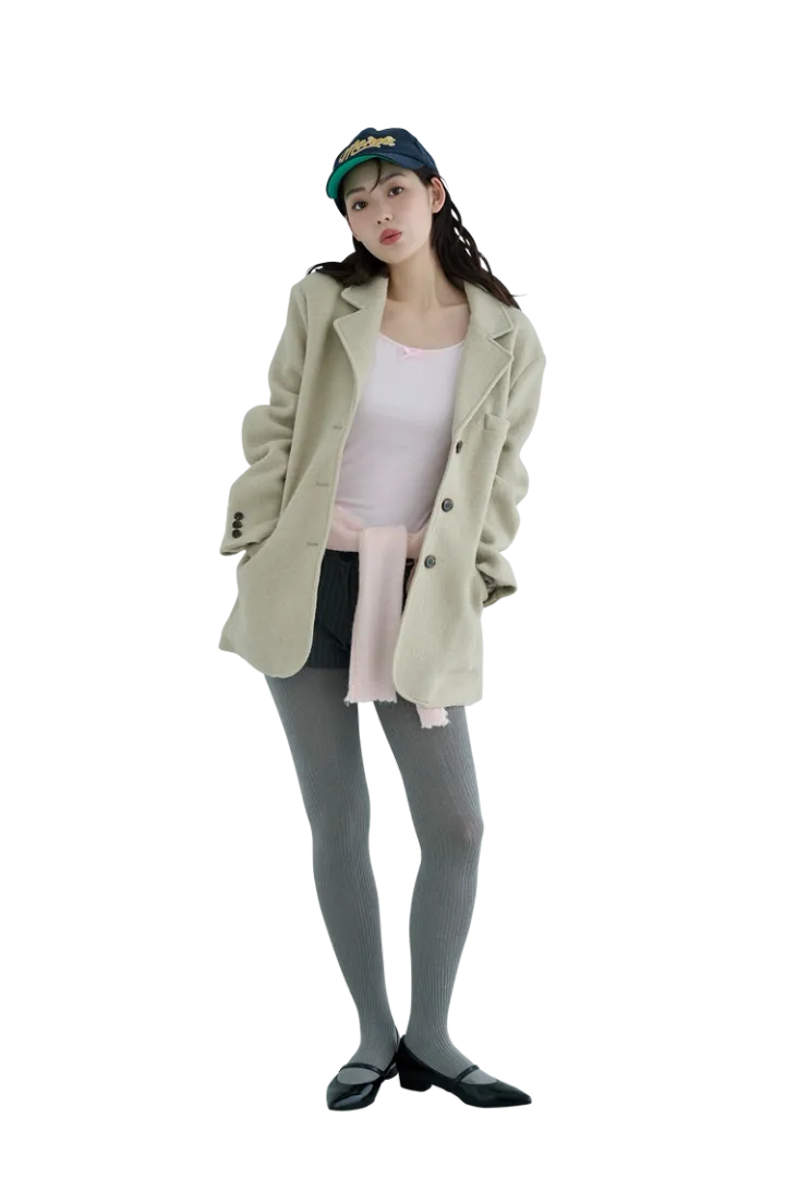 テーラードジャケット 31,905円/HUNCH、マイクロパンツ 12,470円/CRANK(ともにHANA SHOWROOM)トップス 9,900円/BLOOMING CHARM 腰に巻いたカーディガン(ニットキャミソールとセット)4,290円/MORE self LOVE ロゴキャップ 6,600円/Mardi Mercredi(MARDI MERCREDI JAPAN)タイツ 2,640円/靴下屋(Tabio)パンプス 18,150円/ダイアナ(ダイアナ 銀座本店)