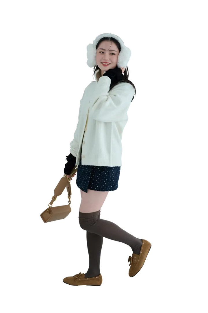 白ニット(スカートとセット)16,940円/MERCURYDUO ルミネエスト新宿店 黒ベロアリボントップス 16,500円/Candy Stripper ドットミニスカート 7,920円/EMODA ルミネエスト新宿店 イヤーマフ 1,599円、デッキシューズ 2,199円/ともにGRL ソックス 1,650円/靴下屋(Tabio)バッグ 85,800円/ピパチャラ(ピパチャラ ジャパン)