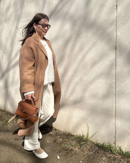 ここに靴下やバッグでホワイトをアクセントとして添えれば、キャメル×ホワイトならではのまろやかで洗練された配色バランスに。カジュアルさと上品なきれいめ感を両立した、大人にぴったりのスタイリングです。