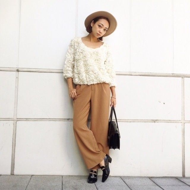 まずご紹介するのは、立体感のある素材を使ったトップスとキャメルパンツのスタイリング。トップスが奥行きをメイク、さらにキャメルパンツの上品さがコーデを大人っぽくまとめてくれますよ。冬アウターを羽織っても、立体トップスがおしゃれなアクセントになってくれます。