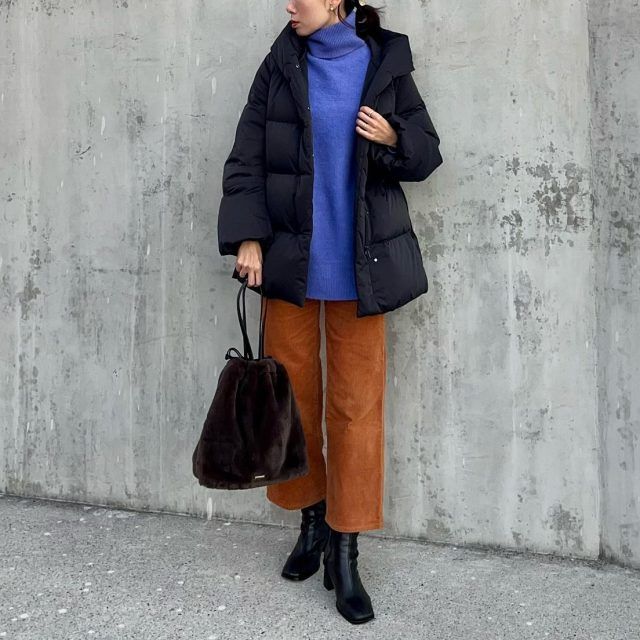 最後にご紹介するのは、キャメルパンツを黒で引き締めた定番カラーのコーデ。キャメルパンツを冬に着こなすなら、黒合わせを思い浮かべる方も多いはず。自然と配色のメリハリが作れて、キャメルの上品さも生きるおすすめの組み合わせです。