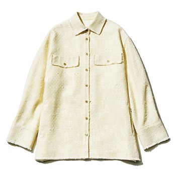 オフ白ツイードシャツ/プレインピープル(プレインピープル青山) ジャケットだと堅苦しいツイードも、シャツの形をとることで日常に寄り添うバランスに。気負わずクラシックなムードを味わえる。