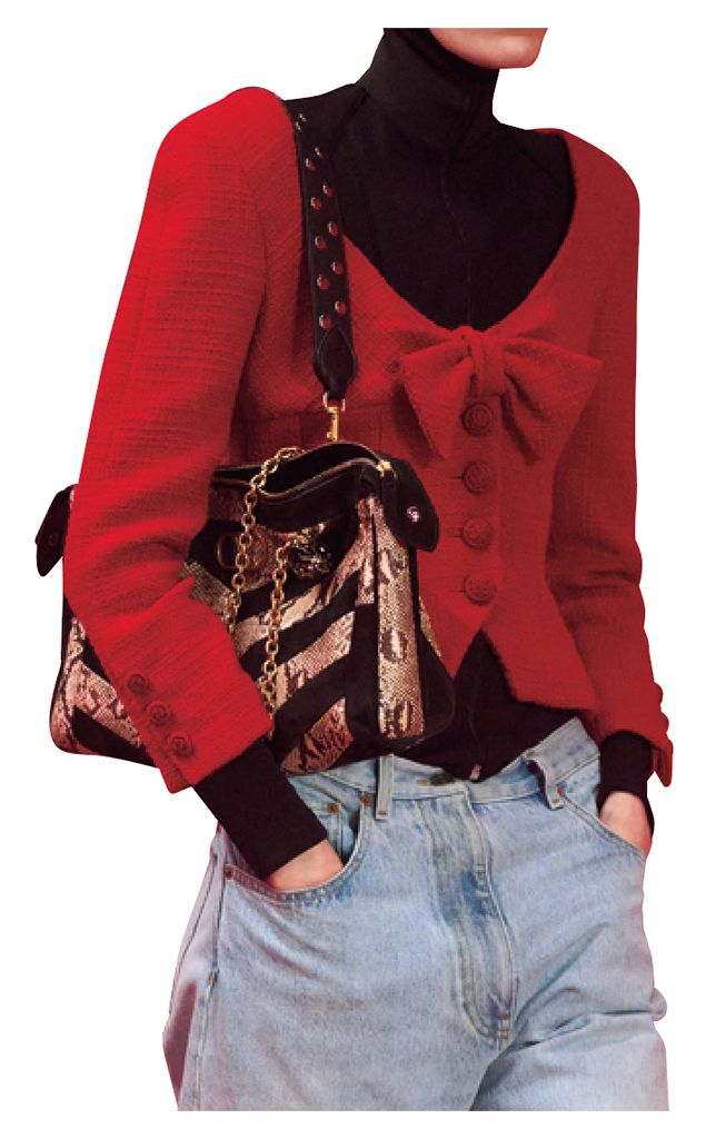 大きな赤リボンが、黒で引き立てることでエッジィに転換。冷静な黒を背景に置くと、愛嬌のあるあしらいの糖度が自然とおさまるテクニック。