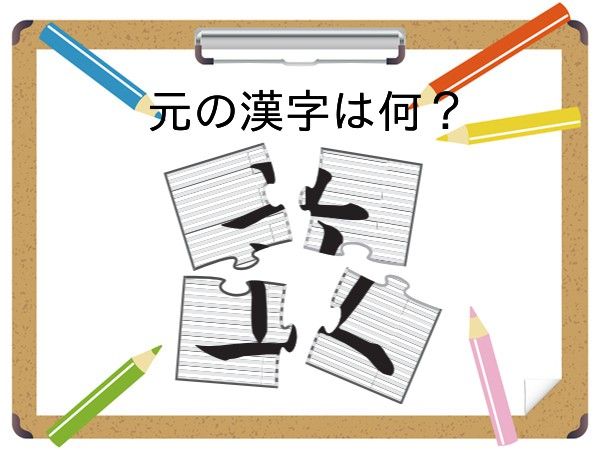 ある漢字が4つに分割されています。散らばったパーツを組み合わせてできる、元の漢字を当ててください。切り口の形がヒントです。