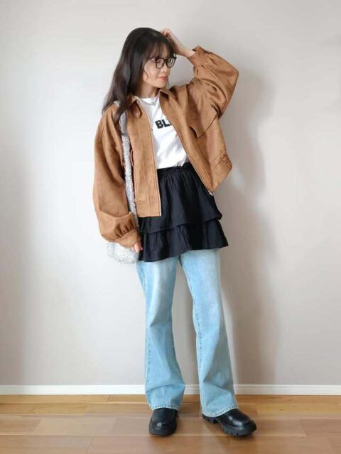 キャメルジャケット×白トップス×黒ボトム