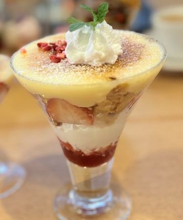 『苺のブリュレパフェ』はシェフのおすすめの一品。「提供する直前にブリュレを仕上げるので、カリッと香ばしい食感と濃厚なカスタードのハーモニーが楽しめます。」とのことでした。