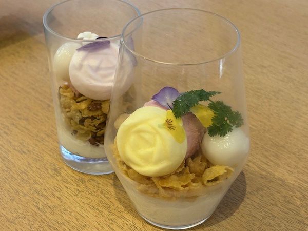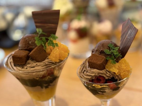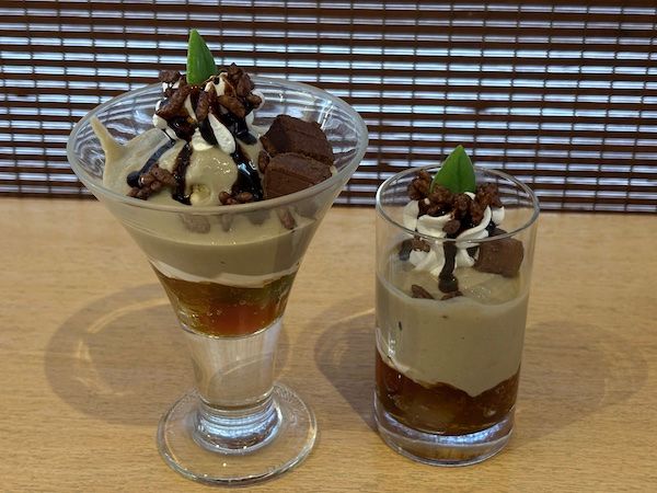 和の要素を取り入れた『ほうじ茶と生チョコのパフェ』は寒天入りのほうじ茶ジュレの上にムースや生チョコがトッピングされています。生チョコとほうじ茶ジュレは意外な組み合わせでしたが、実際食べてみるとけっこう合っていて、最後まで美味しかったです。