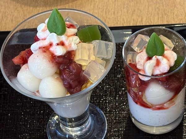 『いちご白玉あんみつパフェ』は刻んだ苺と苺のソースにあんみつがあいまって、トッピングの白玉やあんこと一緒に食べると上品な味わいに。寒天もいい感じにアクセントになって、さっぱりした味わいです。