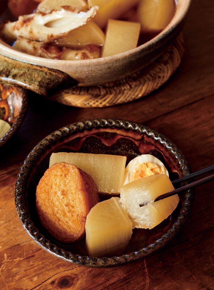 寒い日に恋しくなるおでん。でも、下ゆでや下ごしらえを思うと、少し構えてしまいます。そんなときは、具材をしぼって大根を主役に。甘めの煮汁をたっぷり含んだ味しみしみの大根は、それだけでうなるほど絶品! 下ゆでは電子レンジにまかせて。大根14cmを使い切れる、シンプルで気負わないおでんです。
