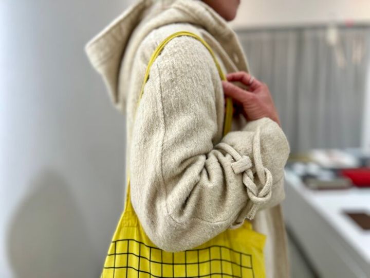 モノトーンの着こなしのポイントになる鮮やかなイエローの布バッグ。「夫のお土産で、ドイツ新国立美術館のエコバッグです」。デザイン性あってカラフルな美術館のエコバッグはマストバイ!