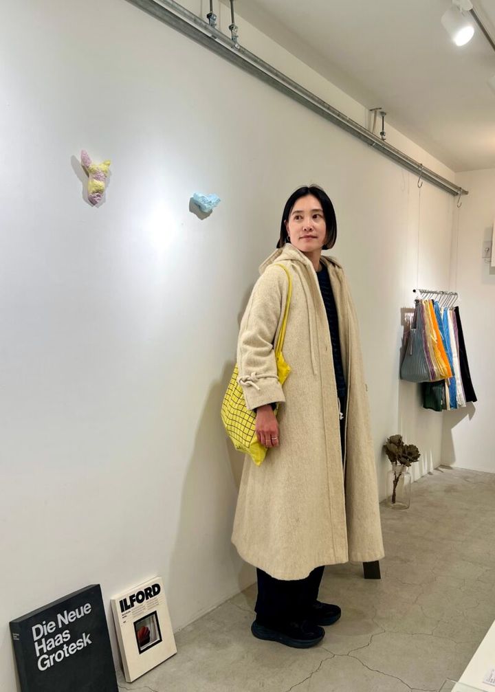 たっぷりと丈のあるAラインのコートの着こなしが印象的な有瀬さんを、京都のギャラリーショップ「TO SEE」で行われていたクリエイターの蚤の市でスナップ!インナーは、「John Branigan(ジョン・ブラニガン)」のアイリッシュツイードのニットと、「ラルフローレン」をリメイクしたコットンチノのイージーパンツ。子育て真っ最中ですが、大人世代になって気をつけていることは「自分の体型に合った服を着ること、着心地の良い素材を選ぶこと、そして清潔感を大事にしています」。