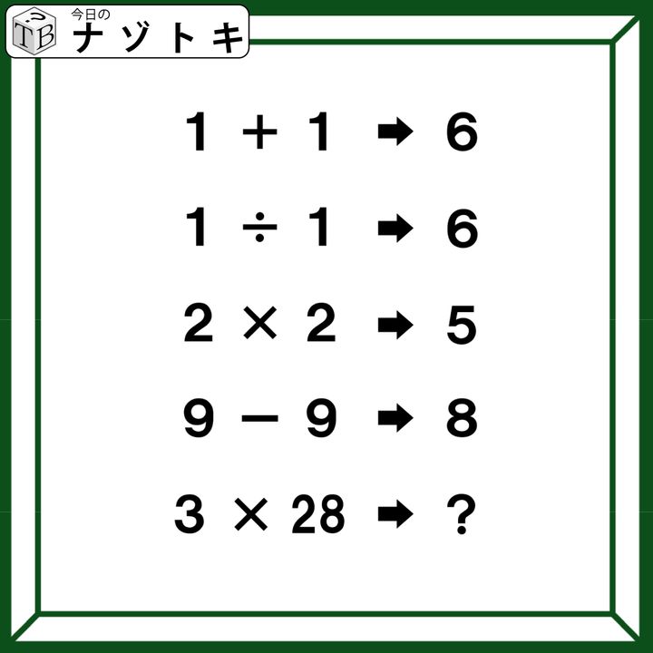 クイズです!「1+1→6、9-9→8」のとき、3×28はどうなる?【難易度LV4.・辛口】