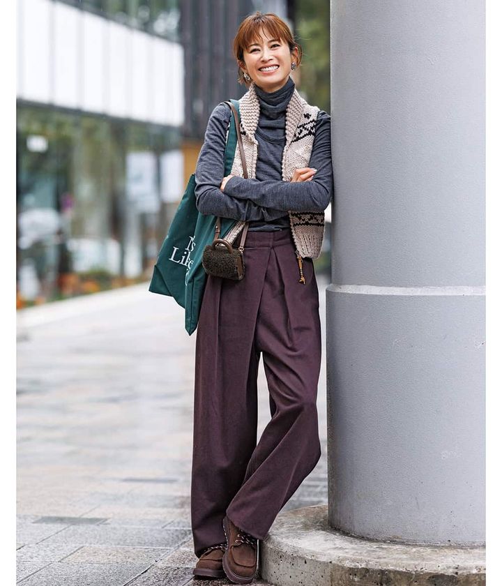 冬コーデにも、春の色づかいにもなじむ絶妙な色味。コレクションでのトレンドが落とし込まれたパンツさえあれば、残りはベーシックでもスタイリングが確実に垢抜けます。(スタイリスト・井関かおりさん)