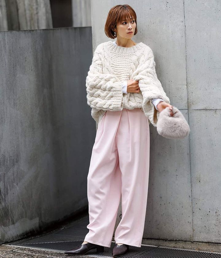 ピンクデニムパンツ¥29,700(ウィム ガゼット/ウィム ガゼット 玉川髙島屋S・C店)ニット¥53,900中に着たカットソー¥20,900(ともにHER.)バッグ¥24,200(アモーメント)パンプス¥25,300(オデット エ オディール/オデット エ オディール 新宿店)ピアス¥55,000(ウノアエレシルバーコレクション/ウノアエレ ジャパン)