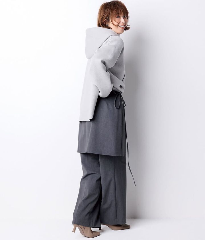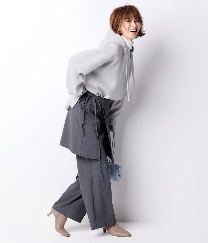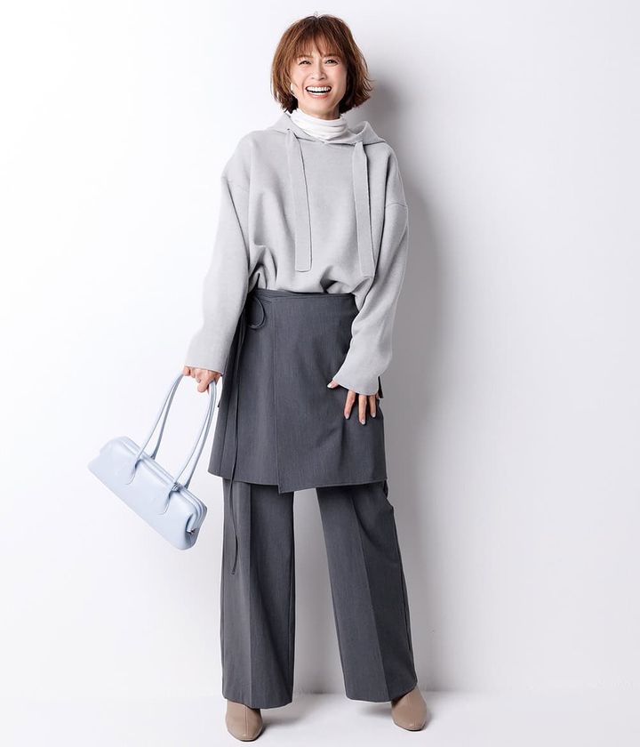 スカートパンツ¥27,500(ミースロエ/MIESROHE ルミネ新宿1店)ニットフーディ¥35,200(プルミエ アロンディスモン/プルミエ アロンディスモン NEWoMan新宿)中に着たカットソー¥9,900(マルゥ ユナイテッドアローズ/ユナイテッドアローズ カスタマーサービスデスク)バッグ¥44,000(オソイ フォー ユナイテッドアローズ/OSOI SHINJUKU)ブーツ¥15,950(ル タロン/ル タロン 有楽町マルイ店)ピアス¥12,100(IRIS 47/フーブス)
