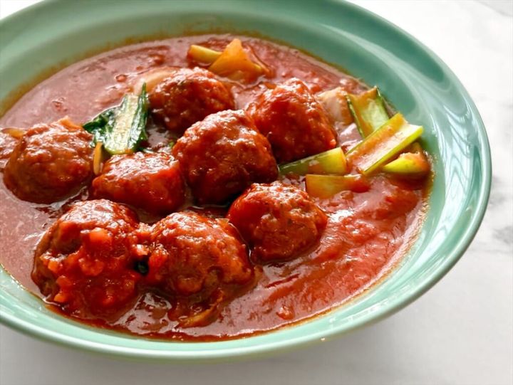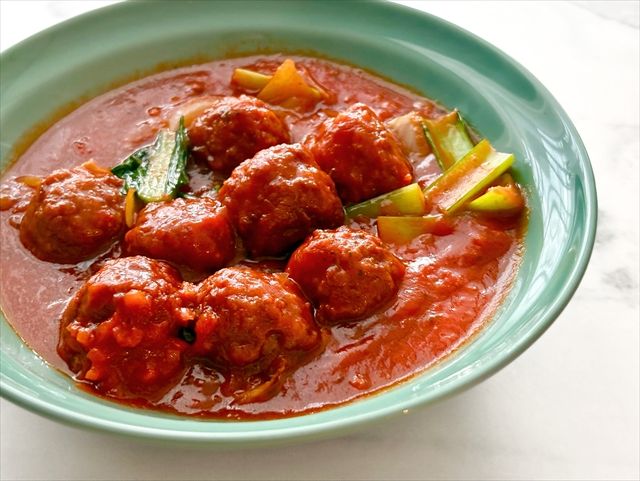 ミートボールがしっかりと熱くなったら火を止め、器に盛ります。本当に、あっという間に完成です。