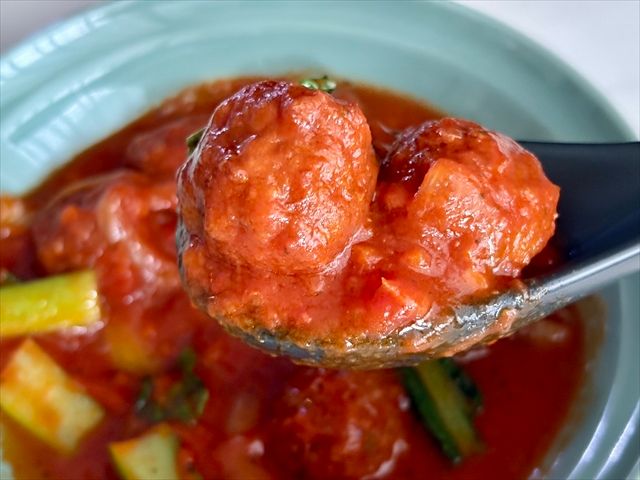 ゴロッと大ぶりなミートボールは食べ応えがあり、満足感も文句なし。ほんのりニンニクが香る濃厚なソースで、洋風の味わいなので、お米だけでなくパンも合いそうです。