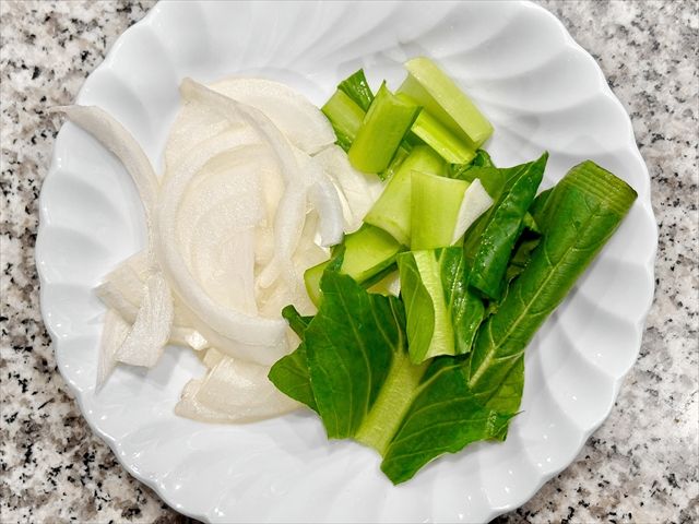 まずは野菜を洗い、小松菜と玉ねぎをカット。
