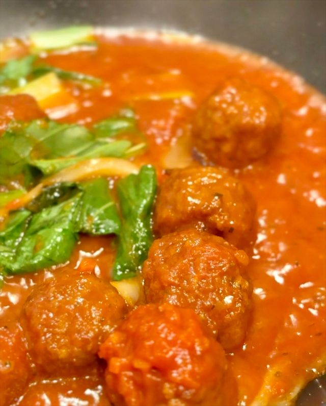 ミートボールをソースごと入れ、さらに小松菜、トマトソース、水(大さじ2)を加え、時々混ぜながら約3分。