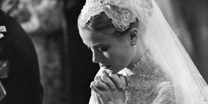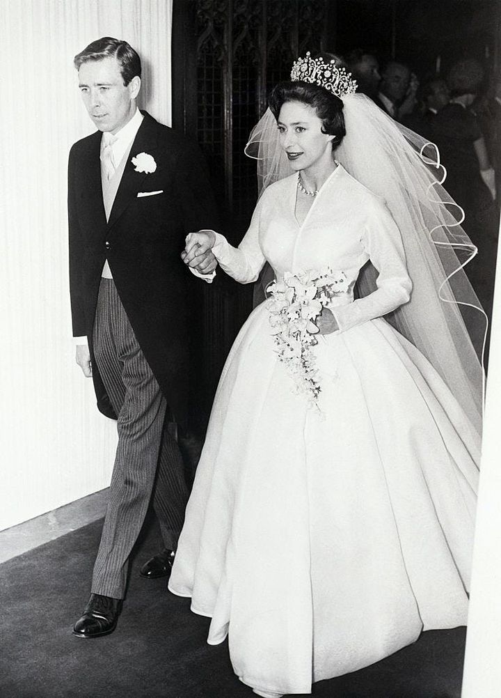 1960年、エリザベス女王の妹マーガレット王女は、ロンドンのウェストミンスター寺院で写真家のアンソニー・アームストロング=ジョーンズと結婚した。王室御用達クチュリエ、ノーマン・ハートネルによる、装飾を一切排したシルクオーガンジーのドレスは小ぶりなトレーンと相まってミニマルな佇まいが際立つ。