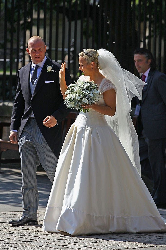 ラグビー選手のマイク・ティンダルとの結婚にあたり、アン王女とマーク・フィリップス大尉の娘であるザラ・ティンダルは、スチュワート・パーヴィンのドレスを着用。シンプルなコルセットドレスはオーガンジーの袖が繊細な雰囲気をプラスしている。