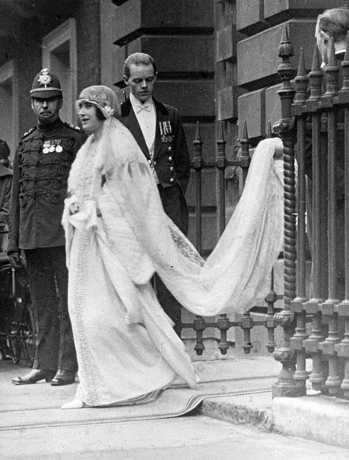 後にエリザベス皇太后として知られるレディ・エリザベス・ボーズ=ライアンは、ウェストミンスター寺院で執り行われたヨーク公爵アルバート王子(後のジョージ6世)との結婚式に際し、1920年代のスタイルを色濃く反映したウエディングドレスを着用。モアレ加工されたアイボリーのシフォン生地に真珠と銀糸の刺しゅうが施されたドレスはメアリー王妃のドレスメーカーであったマダム・ハンドリー=シーモアによってデザインされた。