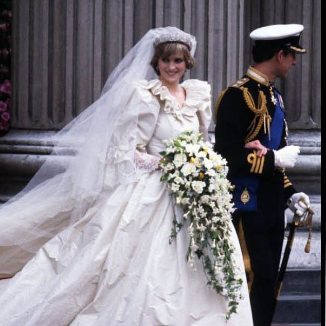 1981年、ロンドンのセント・ポール大聖堂でチャールズ皇太子と結婚したダイアナ妃。その際にまとったスーパーボリュームのドレスは、歴史に残る最も有名なウエディングドレスのひとつとして知られている。