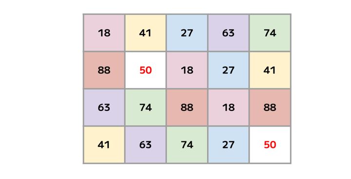 画像の表は横5マス、縦4マス。 そこに「18・27・41・50・63・74・88」という7種の数字が配置されています。