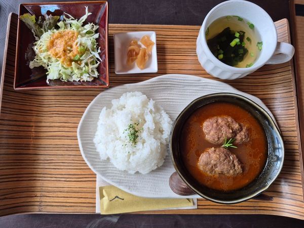 こちらは、1日15食限定ランチです。スープには、鹿児島県産の黒毛和牛と黒豚、姶良のアゴ肉が入ったハンバーグが2個も入ってます!